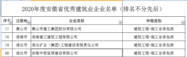近日,安徽省住建厅传来喜讯,2021年度安徽省优秀建筑业企业评选结果已出炉,黄山市建工集团荣获2020年度安徽省优秀建筑业企业---建筑工程施工总承包类优秀建筑业企业。