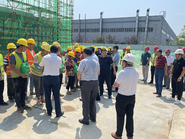 近日,黄山市天气持续高温酷热,骄阳似火,黄山博盛消防装备有限公司新厂区1-2#车间及研发中心工人仍坚守在施工一线,顶烈日,抢工期。7月26日上午,屯溪区委书记吴旭光、区委副书记、区长杨林,区人大常委会主任朱学军,区政协主席袁震宇,区政协副主席杜祖红等一行深入工地现场,开展“送清凉进工地”活动,看望慰问项目部一线职工。