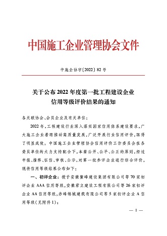 再次荣获施工企业最高信用评级“AAA级企业信用证书”。这是对开云网页版登录入口-开云online(中国)
