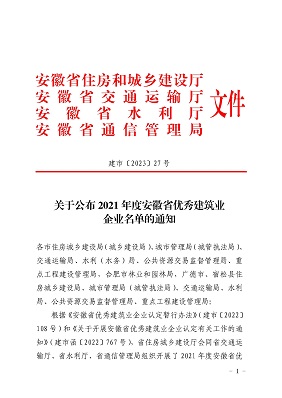 近日,安徽省住房和城乡建设厅公布了“2021年度安徽省优秀建筑业企业”名单,开云网页版登录入口-开云online(中国)