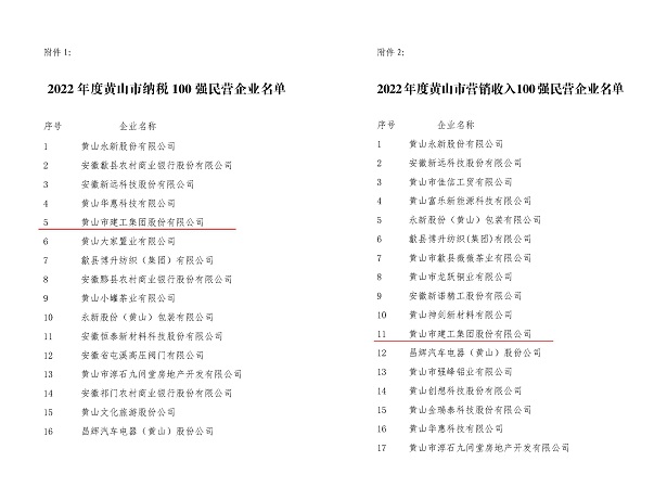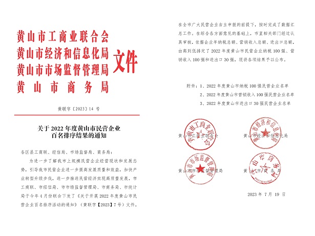 日前,由黄山市工商联、市经信局、市监管局及市商务局联合发布2022年度黄山市民营企业纳税及营销收入百强名单公布,开云网页版登录入口-开云online(中国)