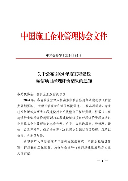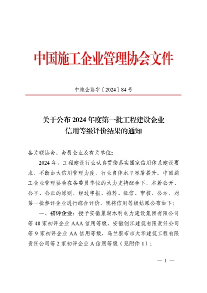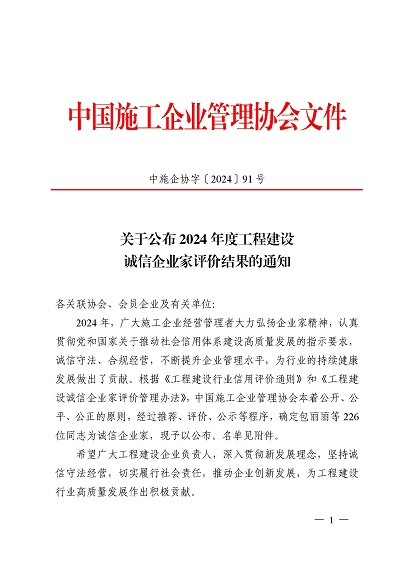 近日,中国施工企业管理协会公布了2024年度第一批工程建设企业信用等级评价结果的通知、工程建设诚信企业家评价结果、工程建设诚信项目经理名单。开云网页版登录入口-开云online(中国) 顺利通过AAA级信用企业的年审,继续保持AAA信用等级的殊荣。开云网页版登录入口-开云online(中国) 总经理叶金发获评诚信企业家,项目经理毕星豪获评诚信项目经理。此次荣誉是对开云网页版登录入口-开云online(中国) 在工程建设领域的综合实力和诚信经营的高度认可。