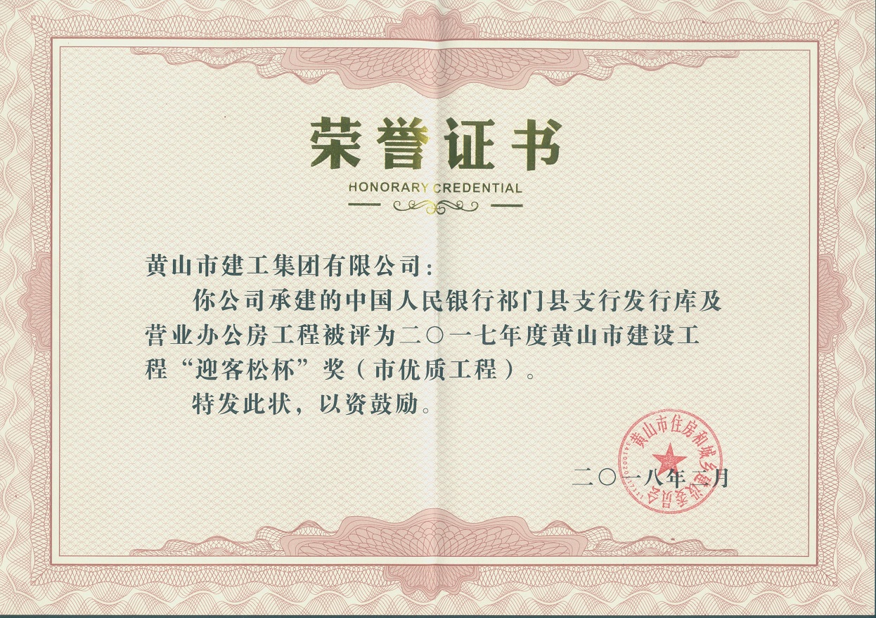 2018年度黄山市建设工程优质工程奖
